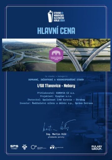 Hlavní cenu v kategorii Dopravní, inženýrské a vodohospodářské stavby získal projekt I/68 Třanovice–Nebory, který měli na starosti kolegové z EUROVIA CZ ve sdružení.