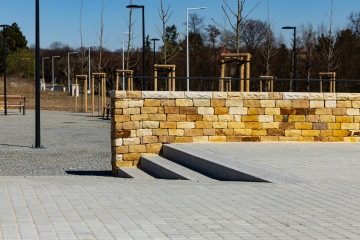 V rámci výstavby náměstíčka jsme realizovali nové opěrné zídky obložené pískovcovým řádkovým zdivem na divokou vazbu, zakončené pískovcovými římsovými deskami s kovovým zábradlím, a také žulová schodiště. Součástí projektu byla rovněž rekonstrukce stávající zdi z kyklopského zdiva podél lipové aleje v délce 20 metrů a výměna betonové římsy s pískovcovými sloupky v délce 105 metrů.