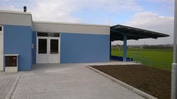 Součástí areálu je provozní objekt, navržen z typových kontejnerů, ve kterém jsou šatny, sprchy, toalety, zázemí pro trenéry a rozhodčí, kancelář, klubovna, ošetřovna, zdroj tepla, sklady, údržba a zázemí pro návštěvníky. Na tento objekt navazuje zastřešená venkovní tribuna pro 249 osob. Nosná konstrukce přístřešku je ocelová se zastřešením z plechové krytiny. Konstrukci tribuny tvoří železobetonové prefabrikáty, uložené na betonových základech. Přístup do areálu je zajištěn komunikací ze zámkové dlažby, lemovanou parkovišti s 30 parkovacími místy.