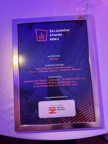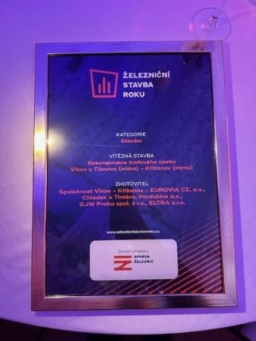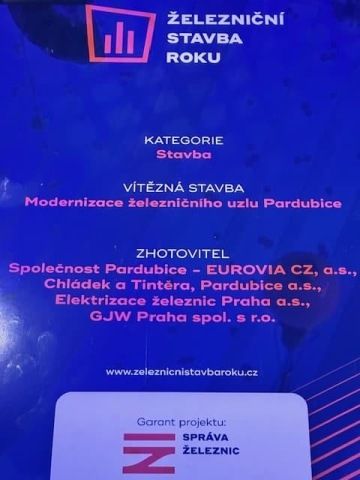 Zabodovali jsme v soutěži Železniční stavba roku a získali ocenění za dvě naše stavby. Porota ocenila projekt Modernizace železničního uzlu Pardubice a Rekonstrukce traťového úseku Vlkov u Tišnova (mimo) – Křižanov (mimo).